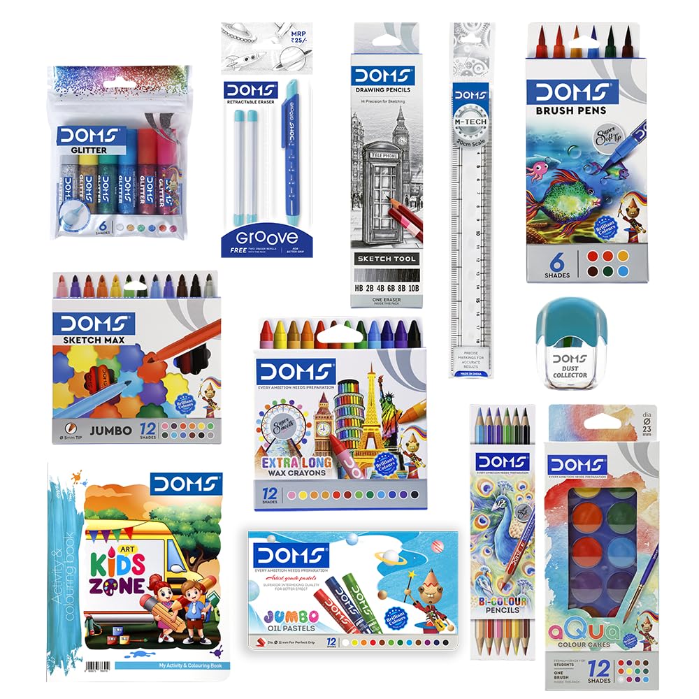 Includes sketch pencils, crayons, watercolor cakes, brushes, erasers, and palette
